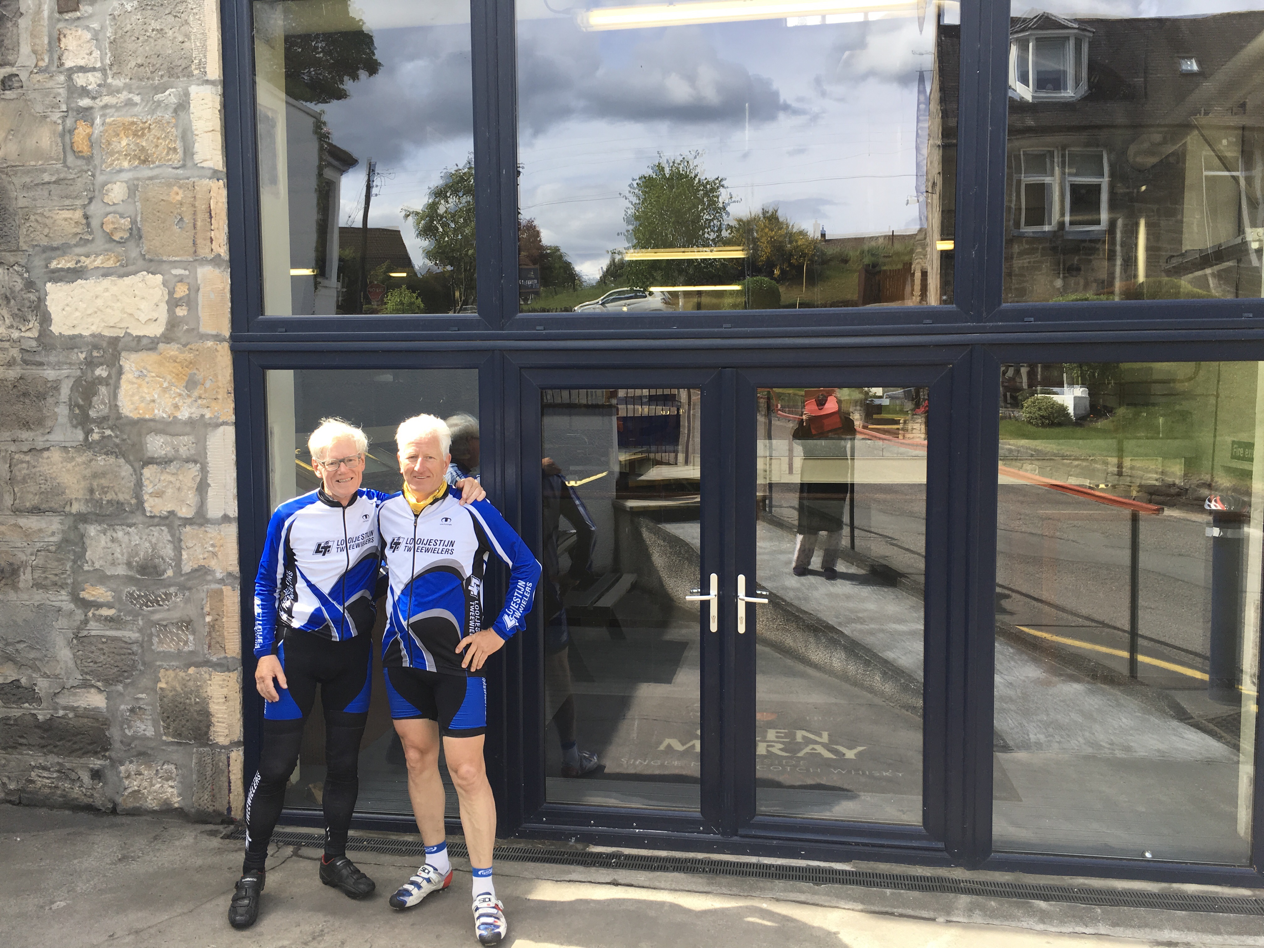 Woesdag 24 mei. Zoals we hadden afgesproken waren we vroeg opgestaan. Rond 7 uur. De zon scheen niet maar het was droog en de temperatuur niet slecht. Het kon wel eens warm worden voor een stelletje bejaarde fietsers. Ons hoor je niet klagen bij droog weer. We hadden afgesproken dat we drie destilleerderijen zouden gaan bezoeken. Het zijn er maar twee geworden. En ondertussen toch totaal 98 km gefietst. Eerst gingen we naar Keith, via Dufftown, voor de Strathila Distillery. Onderweg komen nog een 3 tal destilleerderijen tegen maar deze zijn gesloten voor publiek, m.a.w. je kan misschien het terrein wel op en snel een foto maken! We waren in elk geval op tijd voor de opening van het bezoekerscentrum van Strathila. Als onderdeel van een groter geheel konden ze en mochten ze niets doen aan donaties e.d. De tour was onder maats en dat komt toch doordat een niet schotse gastvrouw de tour begeleide. De nosing and tasting was goed verzorgt. Ik kon de samples in kleine flesjes meenemen. Op de terug weg naar Dufftown realiseerde ik me dat we afgelopen zondag ook al in Keith waren. Als ik dat toen had geweten!!!! Zie de blog van zondag. Maar goed, we waren op weg naar The Glenlivet. Halverwege kom je dan door Dufftown. Dufftown heeft een prachtige whisky information shop. Ik dacht wie niet waagt die niet wint en ging ik naar binnen met de bewuste motivatie brief en vroeg of ze het wilde lezen en eventueel op facebook wilde plaatsen. Met shirt en fiets hebben ze vervolgens een foto genomen voor de shop om op facebook te plaatsen. Toen ik uit de winkel kwam was ik Gerard kwijt, hij was in geen velden of wegen te zien. Na enige tijd kwam hij weer tevoorschijn en was hij naar een openbare toilet geweest. Met zijn tweeën weer op weg. Je kunt op een gegeven moment wel merken dat je in The Glenlivet land/estate ben. Alles heeft de extensie “of Glenlivet”. The Glenlivet is ook geen zelfstandig destilleerderij maar onderdeel van Perno. Zodoende dat ook zij mij verwezen naar hun hoofdkantoor in Glasgow voor sponsorship. Naast hun oude en historische destilleerderij hebben ze een prachtige nieuwe gebouwd, technisch hoogstandje en zeer compact. Mooi om te zien als je van techniek houdt. Geef mij maar het eerzame handwerk. Op de terug weg naar Aberlour reden we verkeerd en maakte daardoor een omweg van 10 km. Niet getreurt, wat zijn nu 10 km op de velen die we al gehad hebben. Maar bij aankomst in Aberlour zijn we toch maar gelijk gaan eten in plaats van naar de tent te gaan om om te kleden en weer terug. We waren moe na 105 km. Tot morgen.