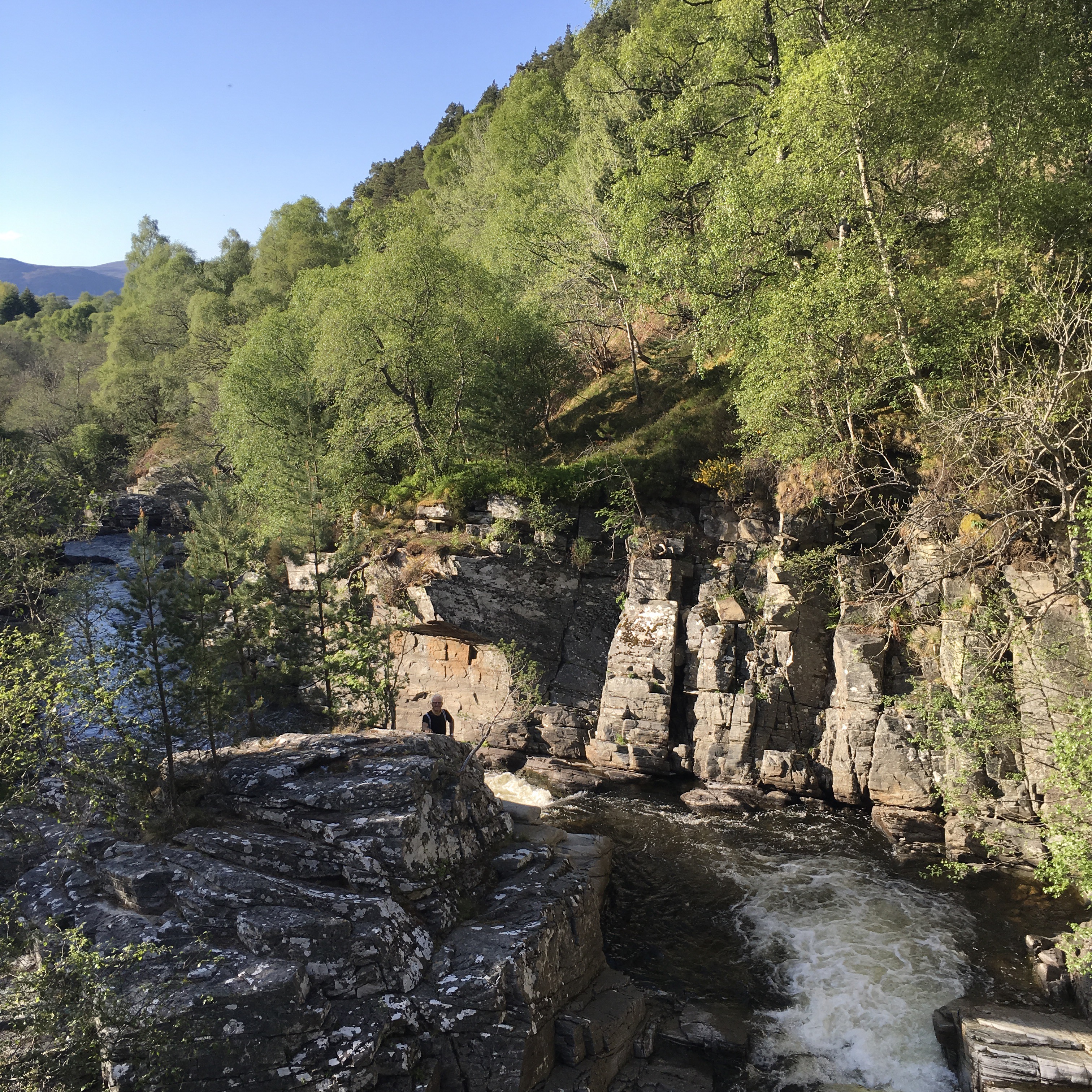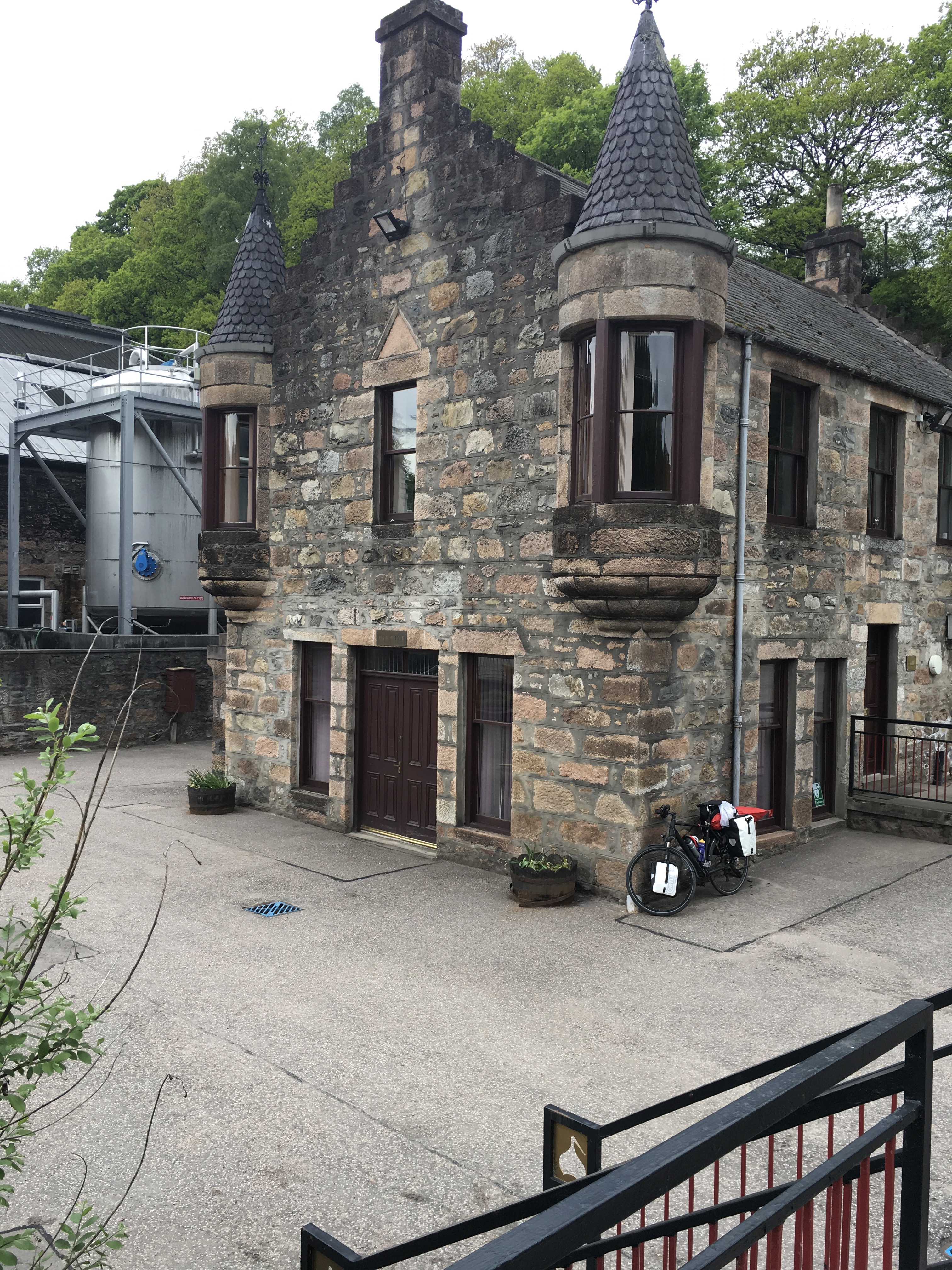 Donderdag 25 mei. We waren vroeg uit de veren want we gingen Aberlour Gardens en Speyside verlaten vandaag. Het was prachtig weer. De zon scheen vol op en zal dat de hele dag blijven doen. Ik heb me dan ook flink moeten insmeren met zonnebrand crème. Zoals jullie waarschijnlijk al gemerkt hebben gaan we de rit flink inkorten. Van de oorspronkelijke 7 weken blijven er 4 over. Speyside mag dan veel destilleerderijen hebben slechts een 10 tal ontvangt bezoekers en staan mensen te woord. De overige zijn productie fabrieken waar maar een paar mensen werken en die zie je niet. Voor vandaag stonden Aberlour en Glenfarclas op het programma en het bereiken van het plaatsje Kingussie. De Aberlour Distillery ligt naast Aberlour en we waren er dus ruim op tijd. De ontvangst ruimte was open en ik naar binnen. Een man kwam uit zijn kantoor en vroeg wat ik wilde. Ik heb hem daarbij het een en ander uitgelegd en de brief overhandigt. Hij zou de brief doorsturen naar marketing. Ook wilde we meelopen met een tour maar dat kon niet want ze waren volgeboekt tot maandag. We waren derhalve dan ook snel klaar bij Aberlour. Wij weer op de fiets, nu richting het zuiden. Op ons pad zouden we dan Glenfarclas Distillery tegenkomen en zo geschiede. Glenfarclas wordt nu gerund door de 6de generatie van de oprichter van de destilleerderij. Het is mooi om te zien, de enthousiasme van de medewerkers, ten opzichte van medewerkers van grotere conglomeraten. We betaalde voor de tour maar kregen het geld terug als donatie voor het fonds £ 15,–, een mooi gebaar. De rondleiding was goed verzorgt. Omdat het zo heet was en we een flink stuk wilde fietsen hebben we niet deelgenomen aan de nosing and tasting. Vanuit Glenfarclas zijn we richting Grantown on Spey gereden. Daar kwamen we aan om ongeveer 13:00 uur en moest er wat gegeten worden en uiteraard, althans door mij, gedronken worden. We hadden er op dat moment 35 km opzitten. Nog 50 te gaan. Vanuit Grantown on Spey richting Kingussie moet je met de fiets de B970 nemen een prachtige en rustige weg. Onderweg passeer je ook nog een bekende sportplaats in Schotland, namelijk Aviemore. Laat ik daar nu precies pech krijgen met mijn fiets. De kogellager van mijn achterwiel was kapot. Een heer die net voorbij liep heeft toen op zijn mobiel gekeken waar de fietsenmaker van Aviemore zat. Wij naar de fietsenmaker alwaar Gerard uitlegde wat er mis was. Als ze het gingen repareren koste het ons zeker een dag. Daarom bestelde Gerard een nieuw wiel en waren we binnen drie kwartier geholpen. Al met al koste het ons 1,5 uur. Toch wilde we Kingussie halen, maar wel onderweg oog blijven houden voor de schoonheid van Schotland. We hebben Kingussie gehaald en slapen nu wild langs een revier. Tot morgen.